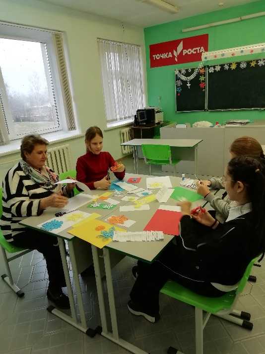 Сегодня юные мастерицы погрузились в волшебный мир творчества: девочки с огромным удовольствием вырезали снежинки и изготавливали гирлянды для украшения классов и зала к Новому году.
